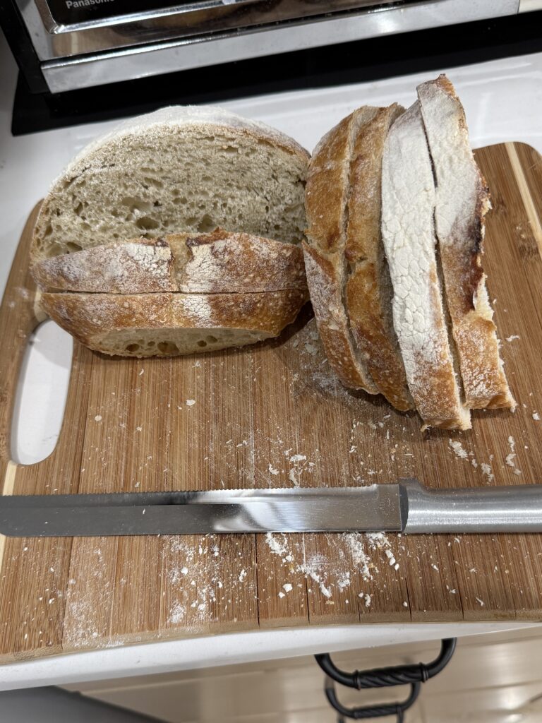 I had no idea what I was going to find inside my half-baked sour dough bread, so I waited until the family came over for the big reveal. The outside was crusty. It had a pretty wing on the top where I scored it. I cut. It wasn’t perfect, but it was cooked throughout and tasted rather good. I think I’ll try again next week, but I’ll have to check with my Facebook groups if a lower temperature will work because it’s obvious my oven does not like 500 degrees.